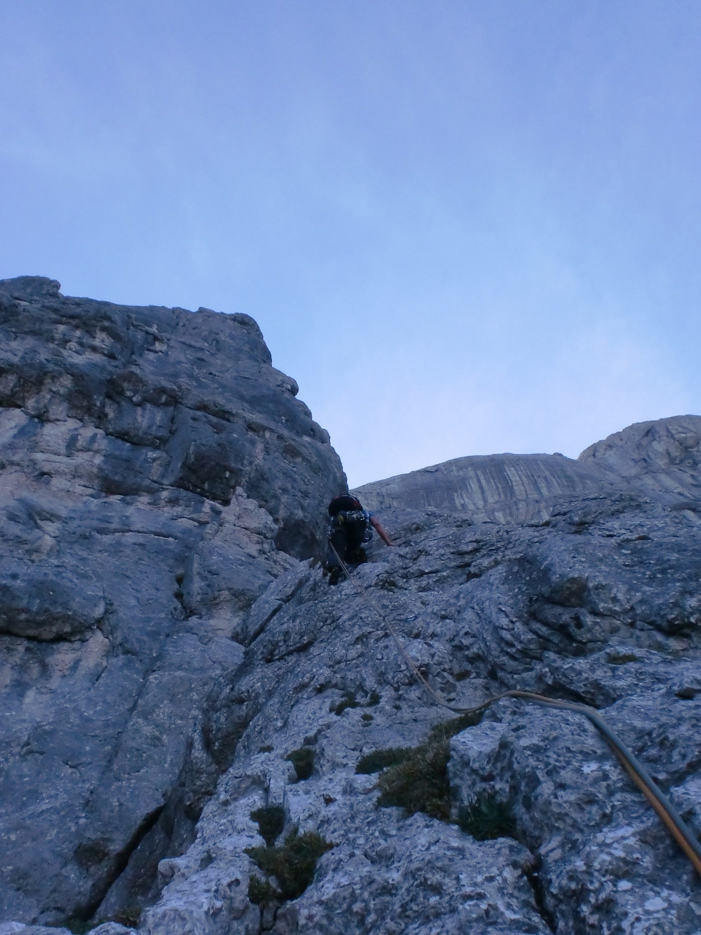 In leichter Kletterei zum Standplatz auf einem Absatz, rechts zweigt die Rosskuppenkante ab.