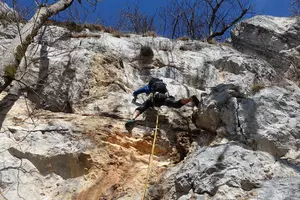 Der Sportmuffelweg ist eine der leichteren Routen an der Breiten Wand, allerdings ist der Höhlendurchschlupf "speziell". In den letzten beiden Seillängen schöne Kletterstellen, dazwischen auch begrünte Passagen.
