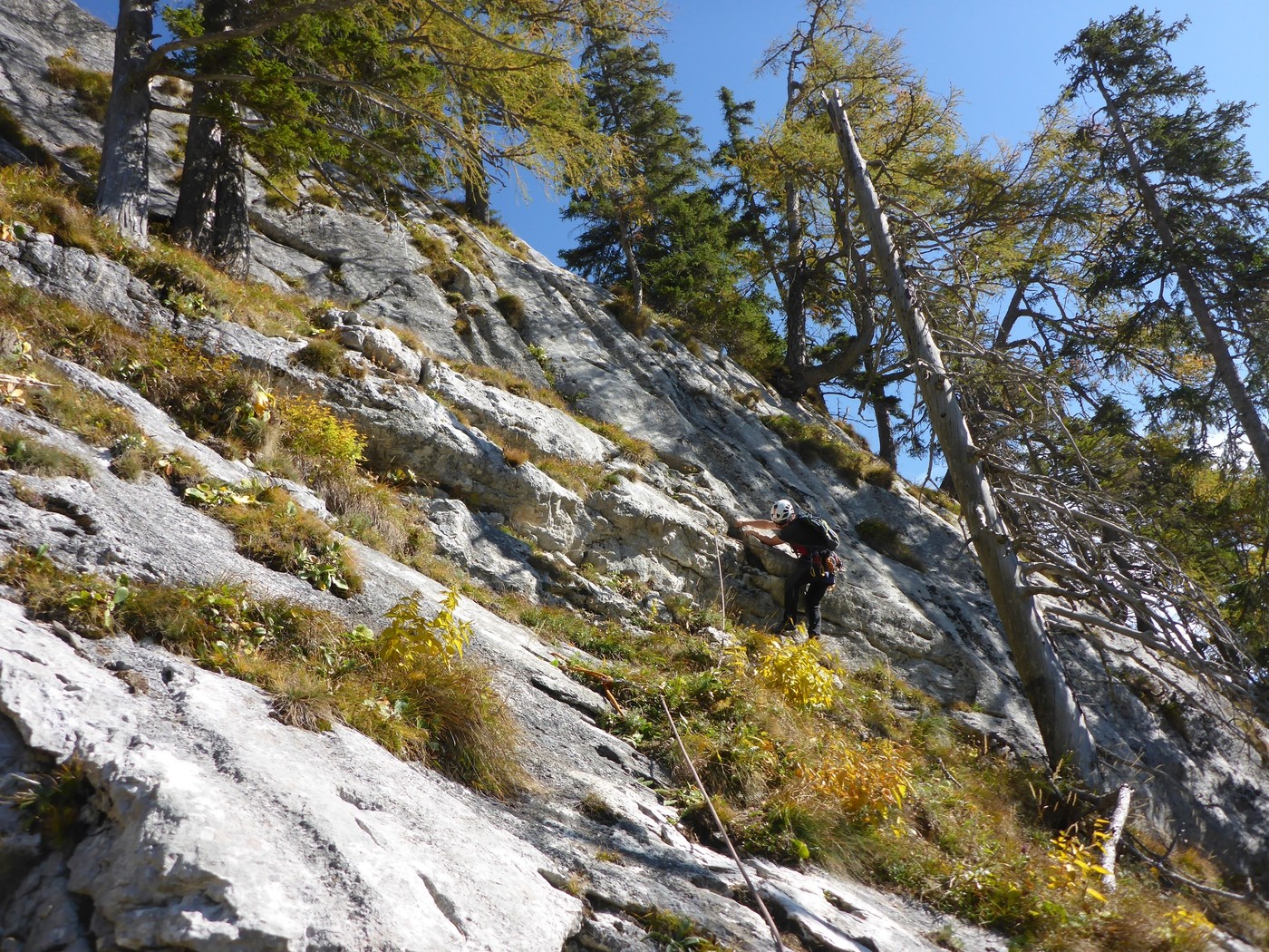 Um sich den Zustieg über die Schotterwiese zu ersparen, wurden zwei Zustiegsseillängen eingerichtet, die geschickt nach links queren.