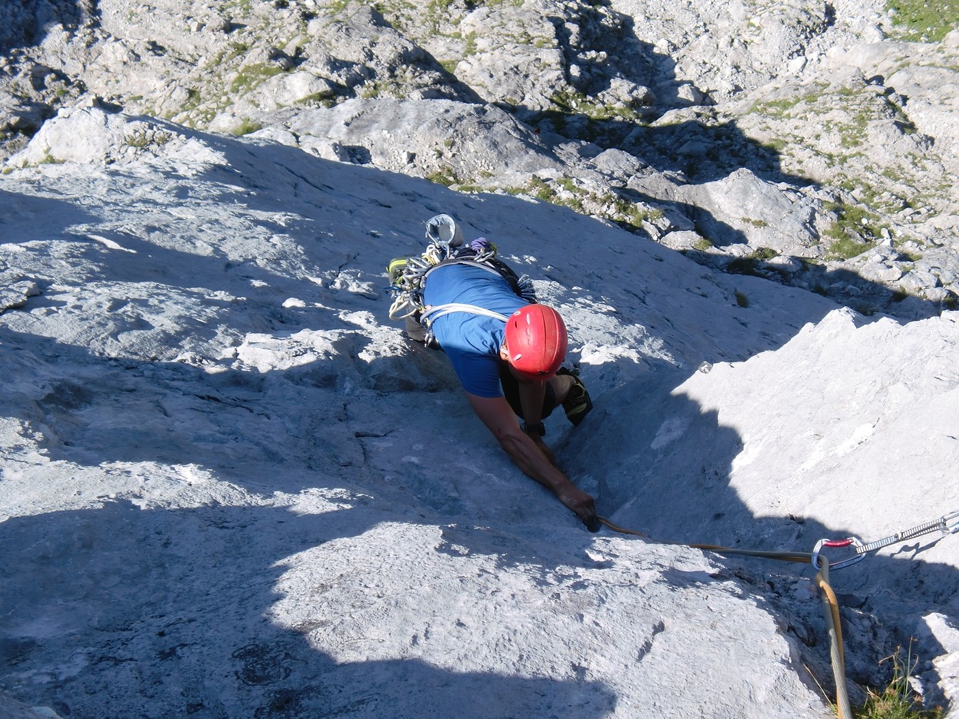 Über die kompakte Platte in perfektem Fels hoch, am Ende über eine kurze Verschneidung (6+) zum Standplatz. Diese Seillänge ist ein echtes Highlight.