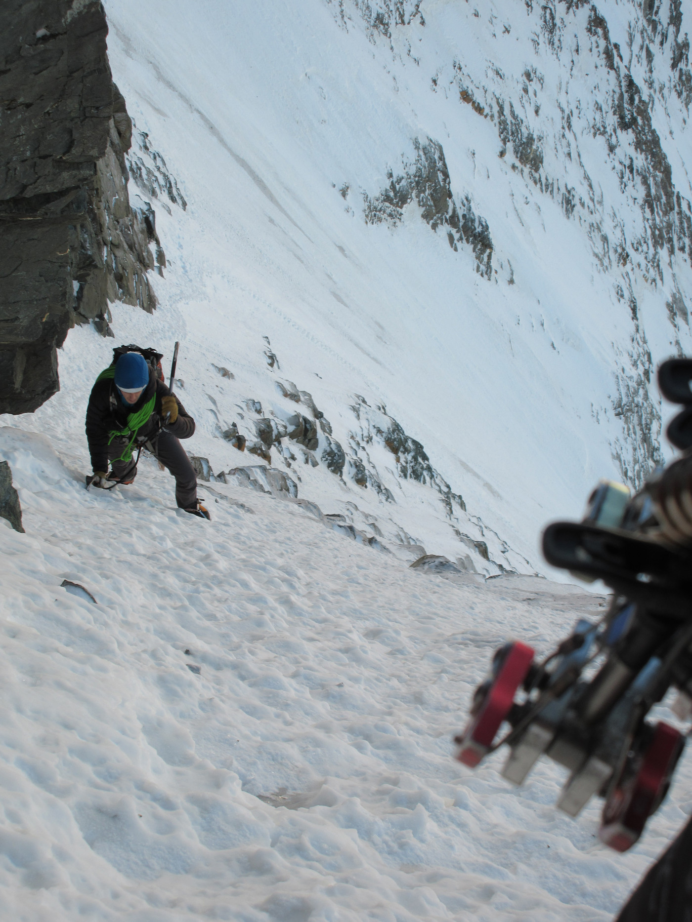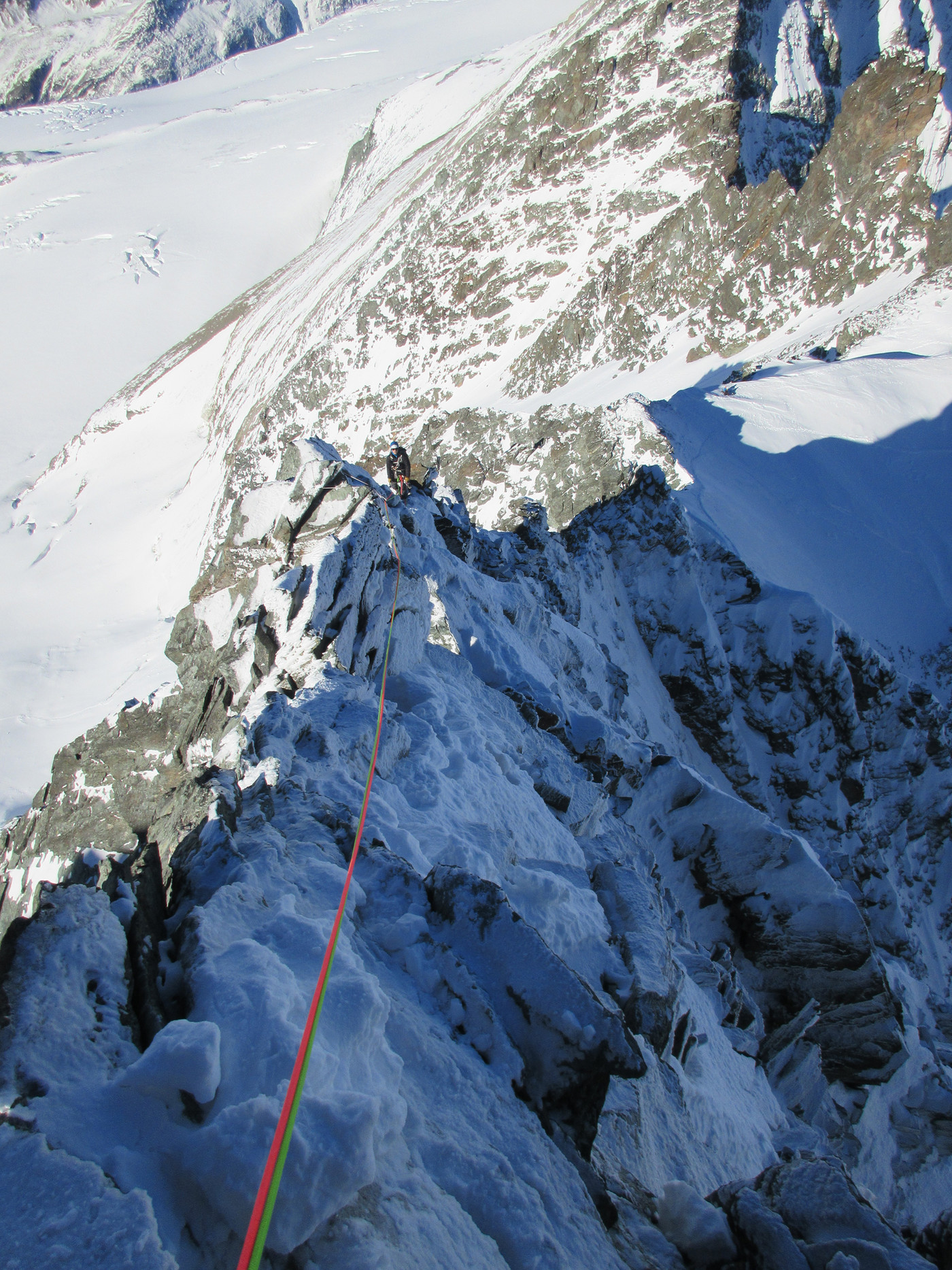 Nordwestgrat im Rückblick Der Nordwestgrat verlangt nochmals konzentriertes Klettern, im Sommer eine einfache Kletterei mit einer kurzen 4er Stelle, ist er bei Schnee unangenehm mit mixed Passagen.