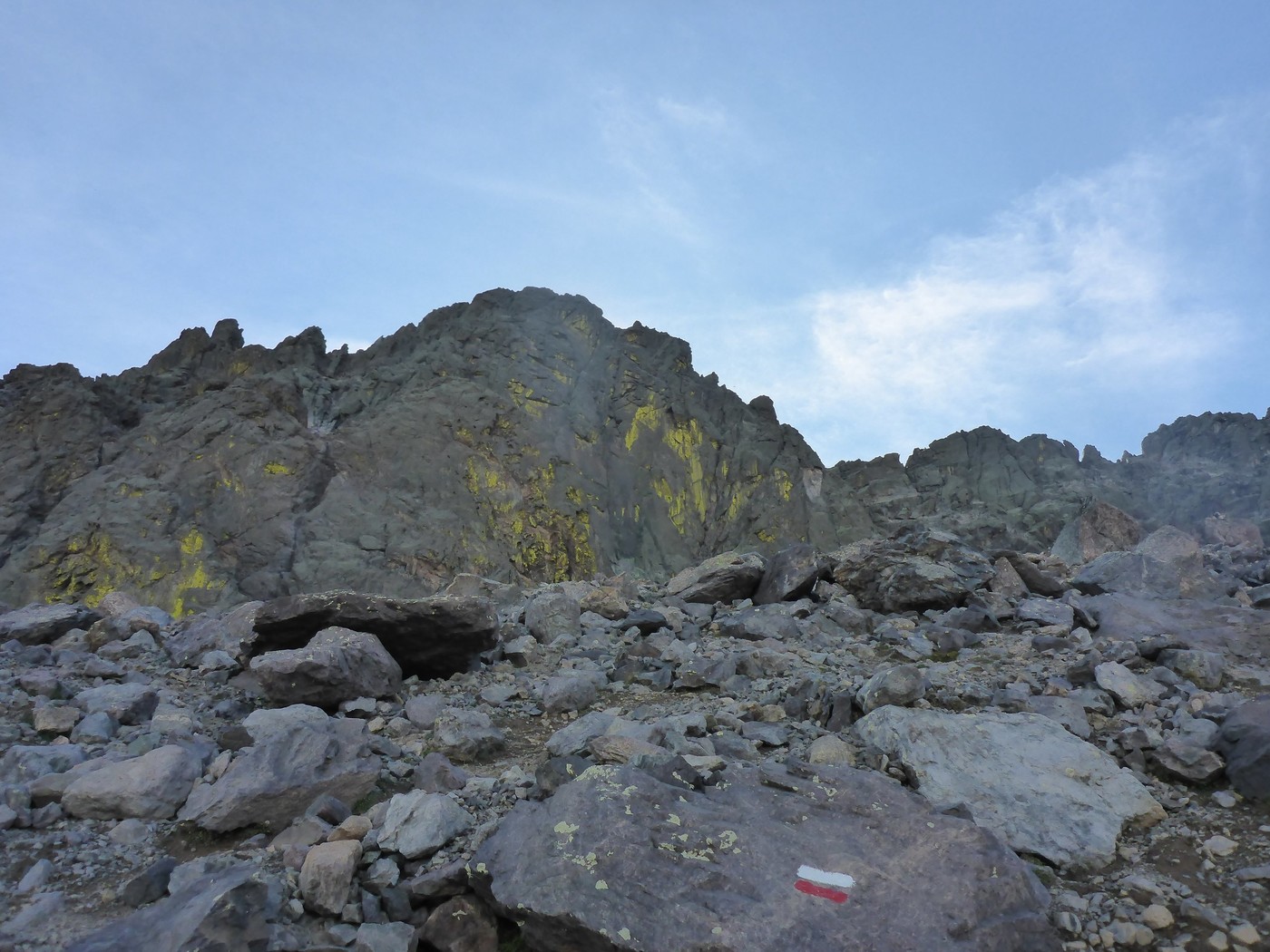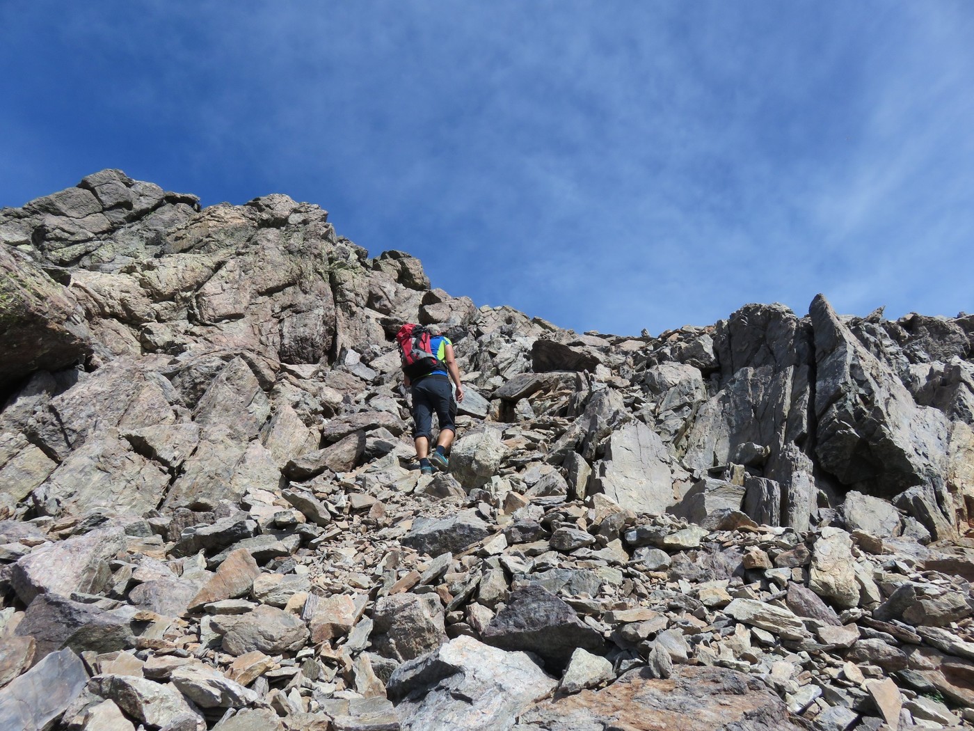 Der Weg wendet sich nicht nach rechts unter den Wänden vorbei bis zur nächsten Felspassage mit Versicherungen, steil geht der Weg weiter bis zum Sattel vor dem Südwestgrat. Es eröffnen sich nun schöne Blicke auf die Südseite. Der Südwestgrat zieht sich noch hin, vorwiegend blockiges Gelände in stetem auf- und ab, bis man zum großen Vorgipfel und weiter zum Hauptgipfel gelangt (ca. 1 Stunde ab dem Sattel).