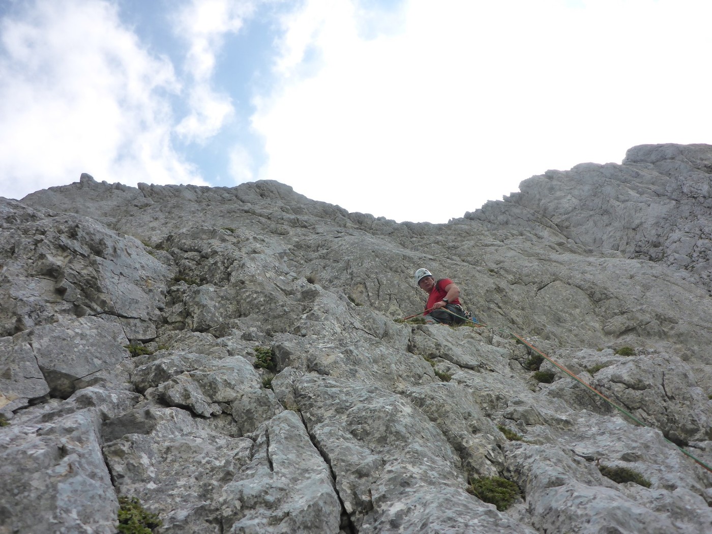 Vom Standplatz linkshaltend über eine schöne Wandpassage in einen Riss, danach wird das Gelände einfacher, über eine schrofige Rinne auf eine grasdurchsetzte Passage zum Standplatz unter dem Pfeiler.