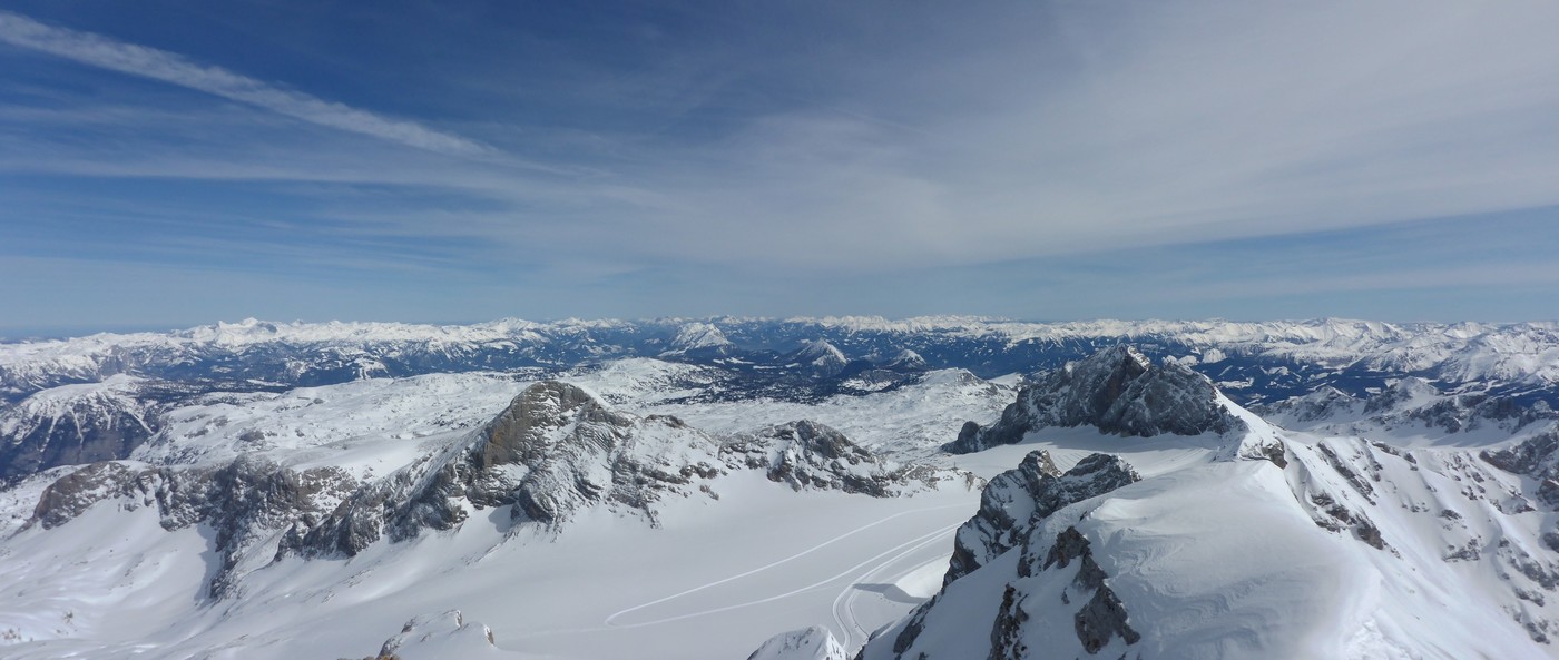 Vom Fuße des Randkluftsteig über den breiten schönen Hang zum präparierten Gletscherweg abfahren. Danach besteht die Möglichkeit über eine der Gletscherzungen des Hallstätter Gletschers abzufahren, die mittlere ist dabei die lohnendste. Vom tiefsten Punkt über einen Gegenanstieg zur Symonyhütte.