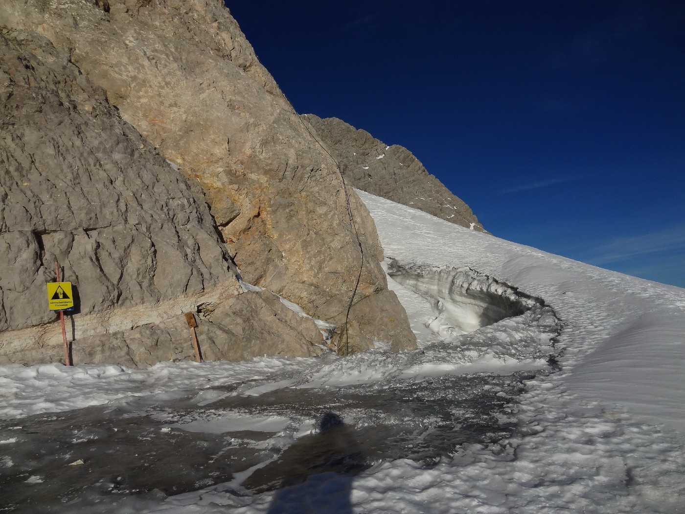 Achtung beim Übergang vom Klettersteig auf den Gletscher, je nach Schneelage kann die Randkluft ein Problem darstellen oder nicht, ev. Seilsicherung empfehlenswert, ausrutschen verboten!!! Mittlerweile wurde das Stahlseil beim Schultereinstieg bis in die Randkluft verlängert.