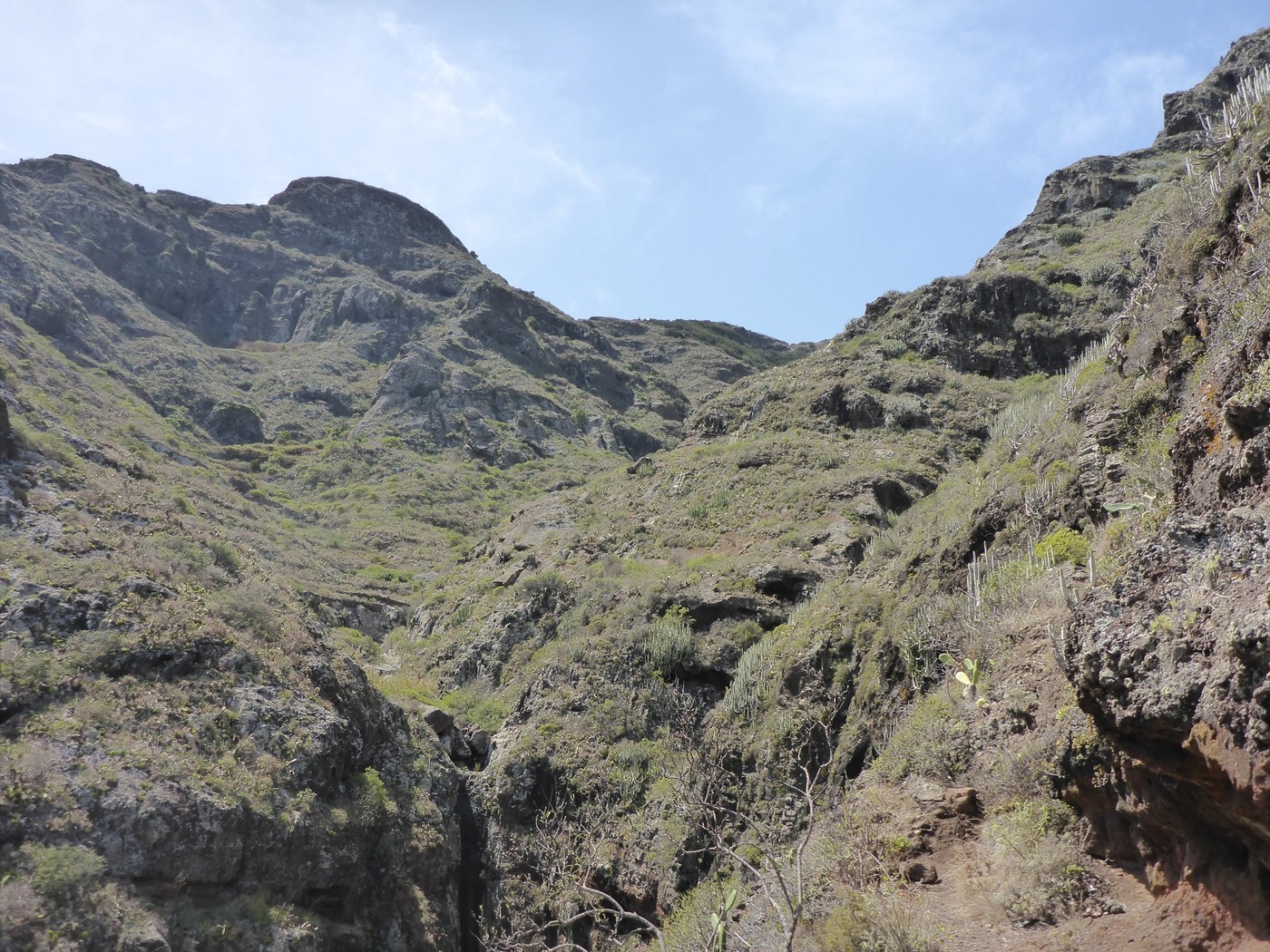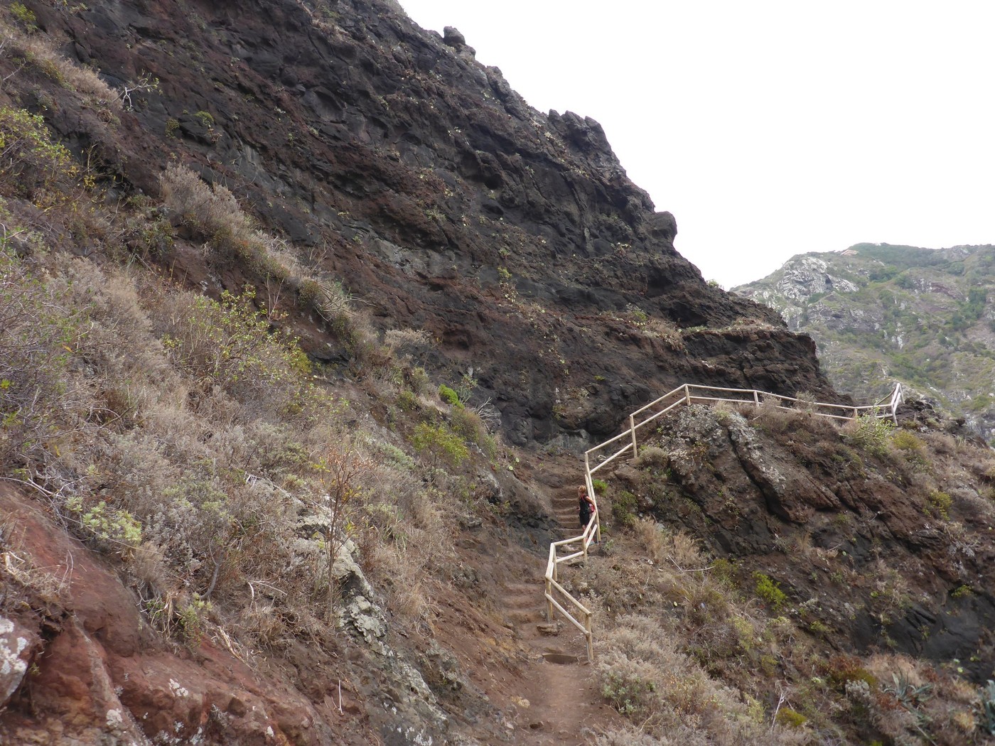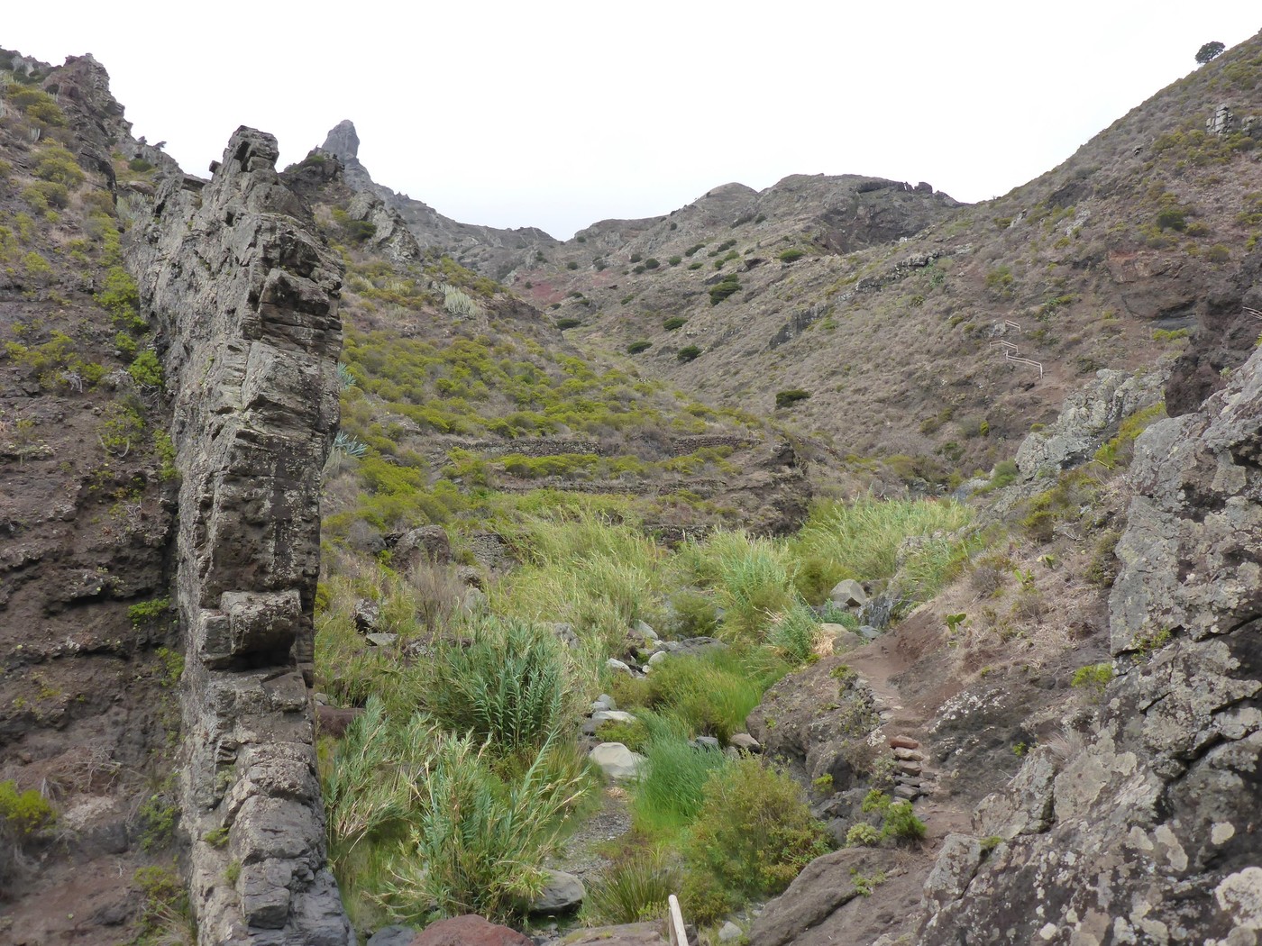 Man überquert schließlich den Bach (auf Steinmänner achten), ehe es steil neben Terrassen nach oben geht und weiter in Serpentinen links den steilen Hang hoch, bis man bei einem Fels (überhängend) ansteht, hier links oder rechts vorbei und über dem Felsen links auf die Scharte, an der wieder der Barranco gewechselt wird. Links ist nun der steile Barranco mit einem trockenen Wasserfall zu sehen, es geht weiter in den Barranco, kurze Zeit geht man im Bachbett ehe rechts steile Stufen aus diesem raus führen.
