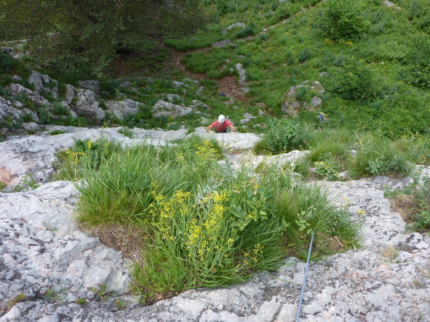Vom Standplatz gerade rauf (steil, kurze 7- Stelle), danach über in die Plattenzone weiter. In einem Rechtsbogen in die steiler werdende Platte. Am Ende über eine schräge Linksquerung zum Standplatz.